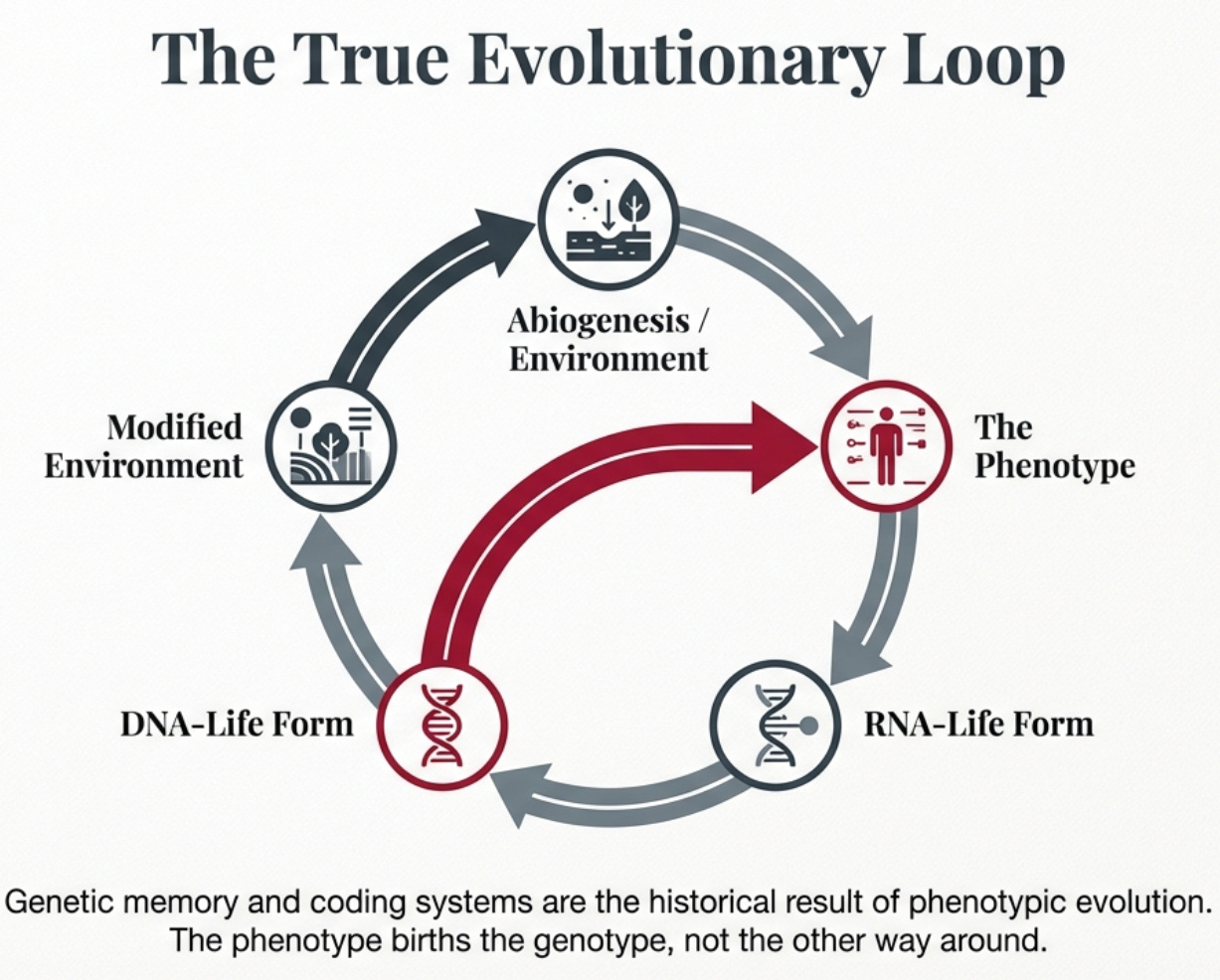 Abiogenesis/Environment → The Phenotype → RNA-life form → DNA-life form → Environment →