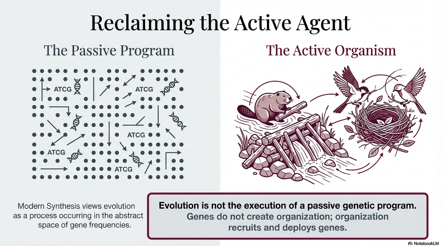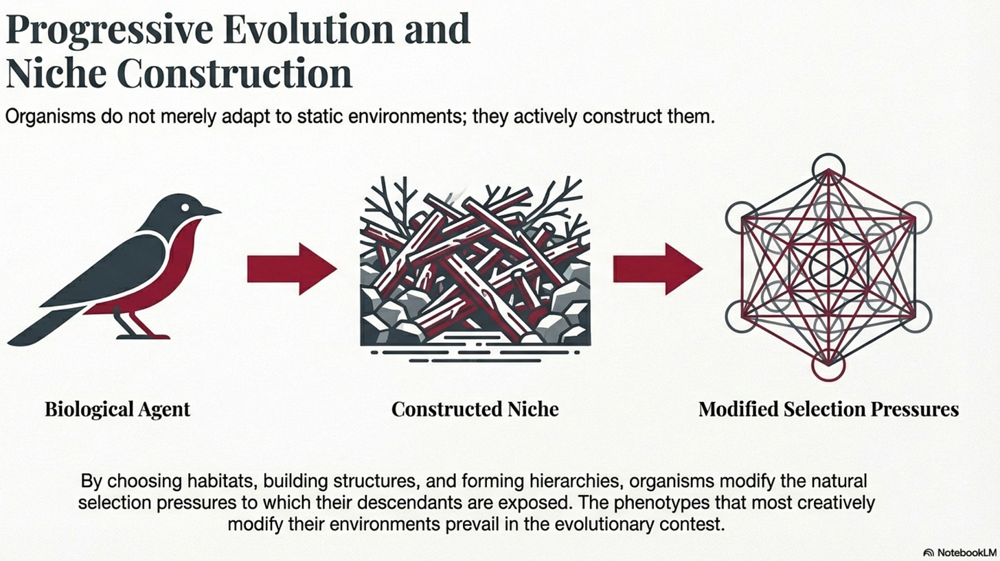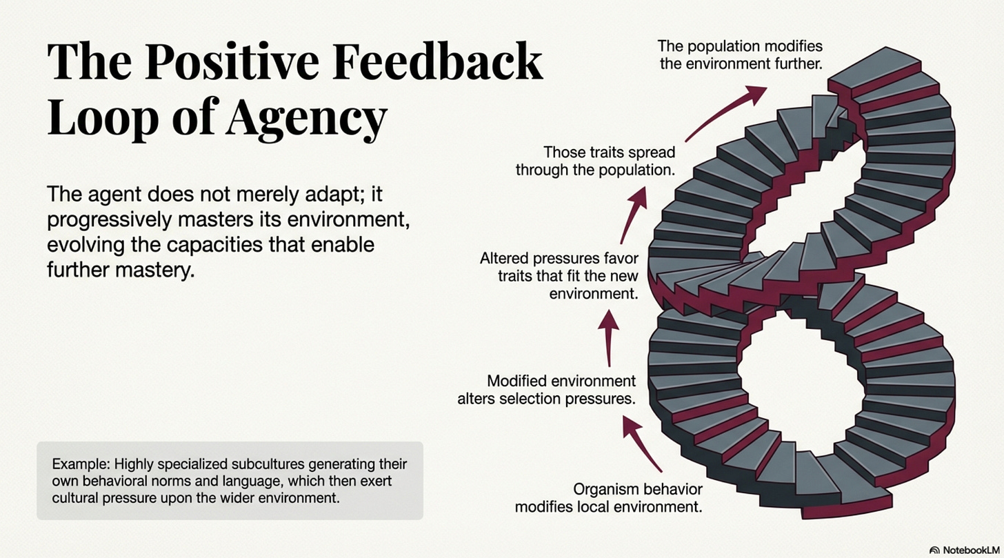The agent does not merely adapt to its environment; it progressively masters its environment, and in mastering its environment, it evolves the very capacities that enable further mastery. The phenotype gets into the driver’s seat not by a single revolutionary act but through a progressive ratcheting of agency and environmental modification that, over evolutionary time, transforms the relationship between organism and environment from one of passive submission to one of active direction.