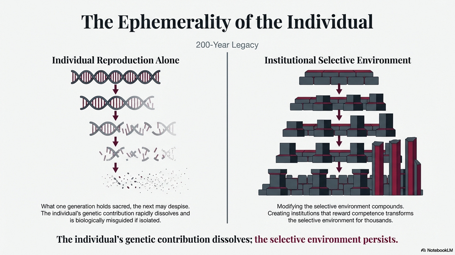 If we analyze the question in terms of individual impact over 200 years, the individual who left a cultural legacy wins decisively over the individual who left merely a genetic legacy. The cultural legacy persists as a coherent, recognizable, and functionally consequential entity; the genetic legacy has been atomized beyond recognition. This does not mean that genetic continuity is unimportant. But it means that the most effective way to influence the evolutionary trajectory of the group is not through individual reproduction alone but through the modification of the selective environment through niche construction at the cultural, institutional, and political level.