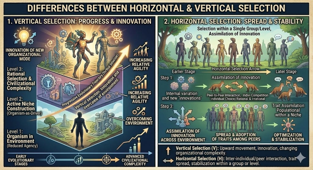 The process by which an organism is overcoming the environment, as I write in my manifesto is through vertical selection, or innovation of a new organizational mode that increases the relative agility of the organism in relation to the environment. It is in that state, that the organization becomes the driver of progress, it produced an innovation which elevated itself above the environment and then than follows by a horizontal progress, or the assimilation of the innovation (or its counter) across the environment.