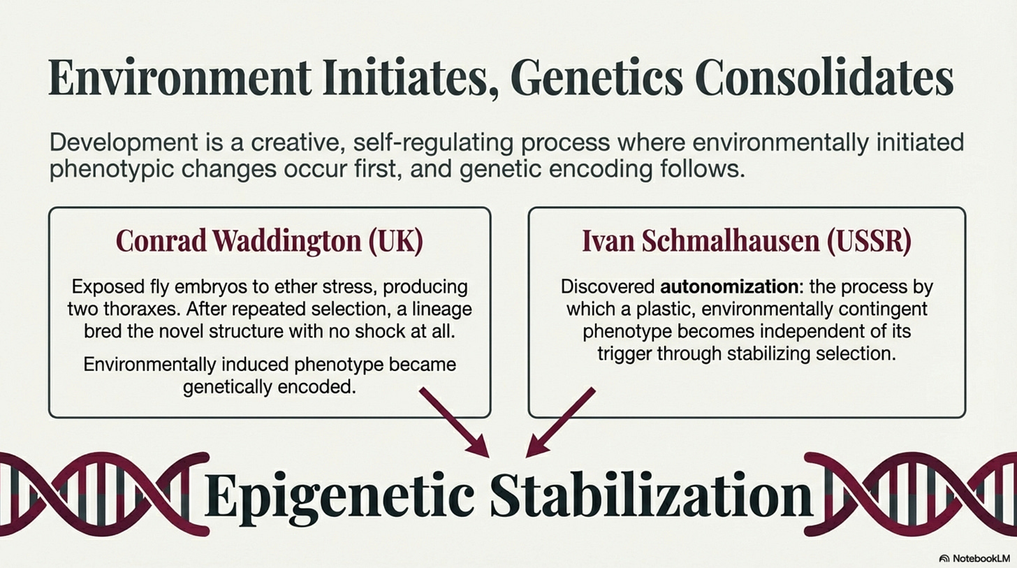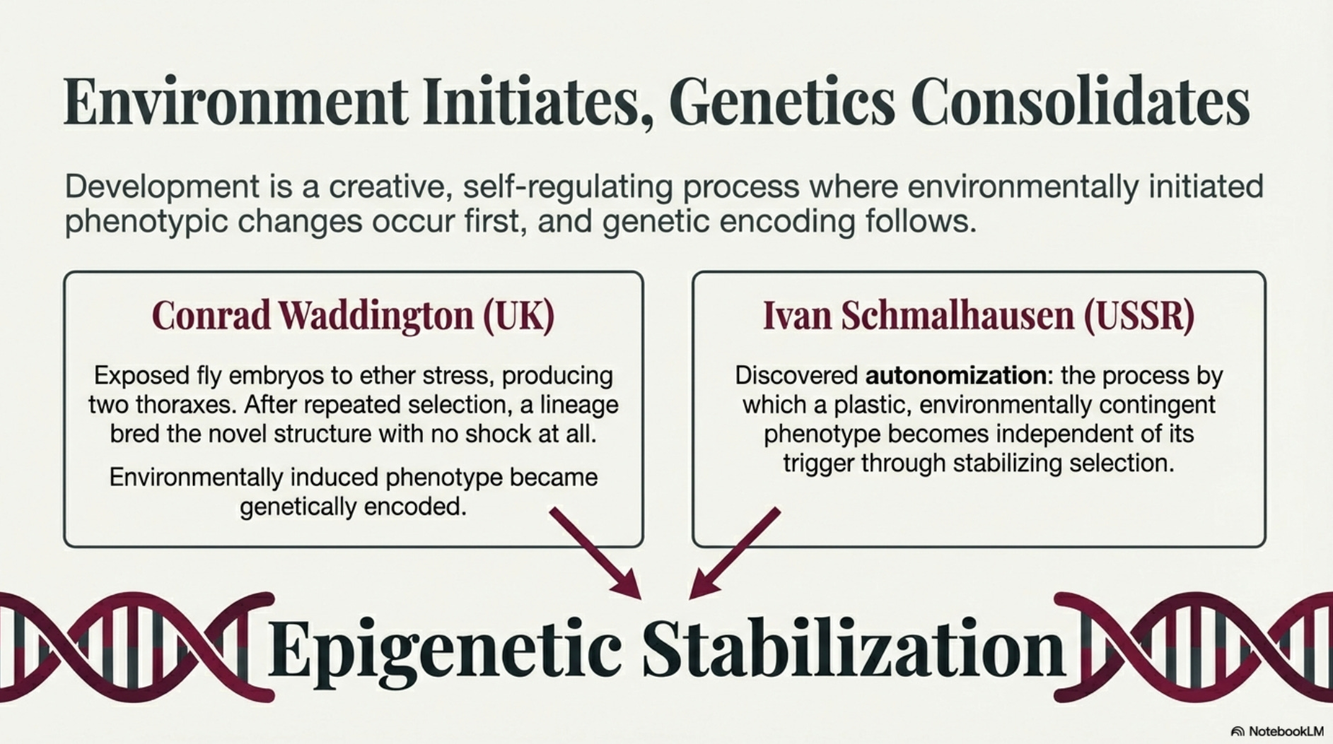 Both researchers, from opposite sides of the Iron Curtain, converged on the same insight: development is not a passive readout of genetic instructions. It is a creative, self-regulating process, and the novelties it produces can become genetically entrenched after the fact.
