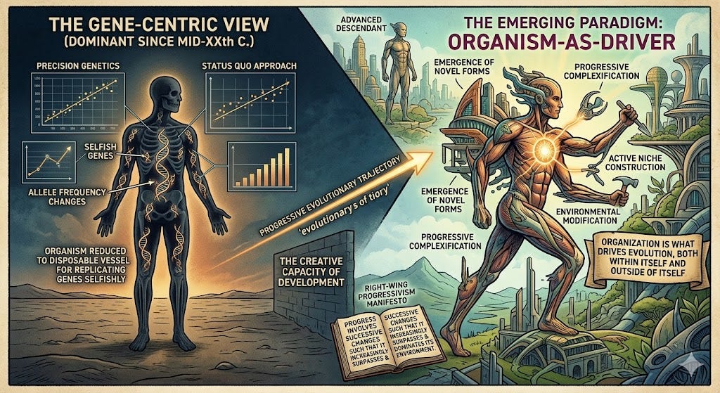 As my Right-Wing Progressivism Manifesto establishes, progress involves successive changes to an organization such that it increasingly surpasses and dominates its environment. It naturally highlights the thesis that the organization is what drives evolution, both within itself and outside of itself.
