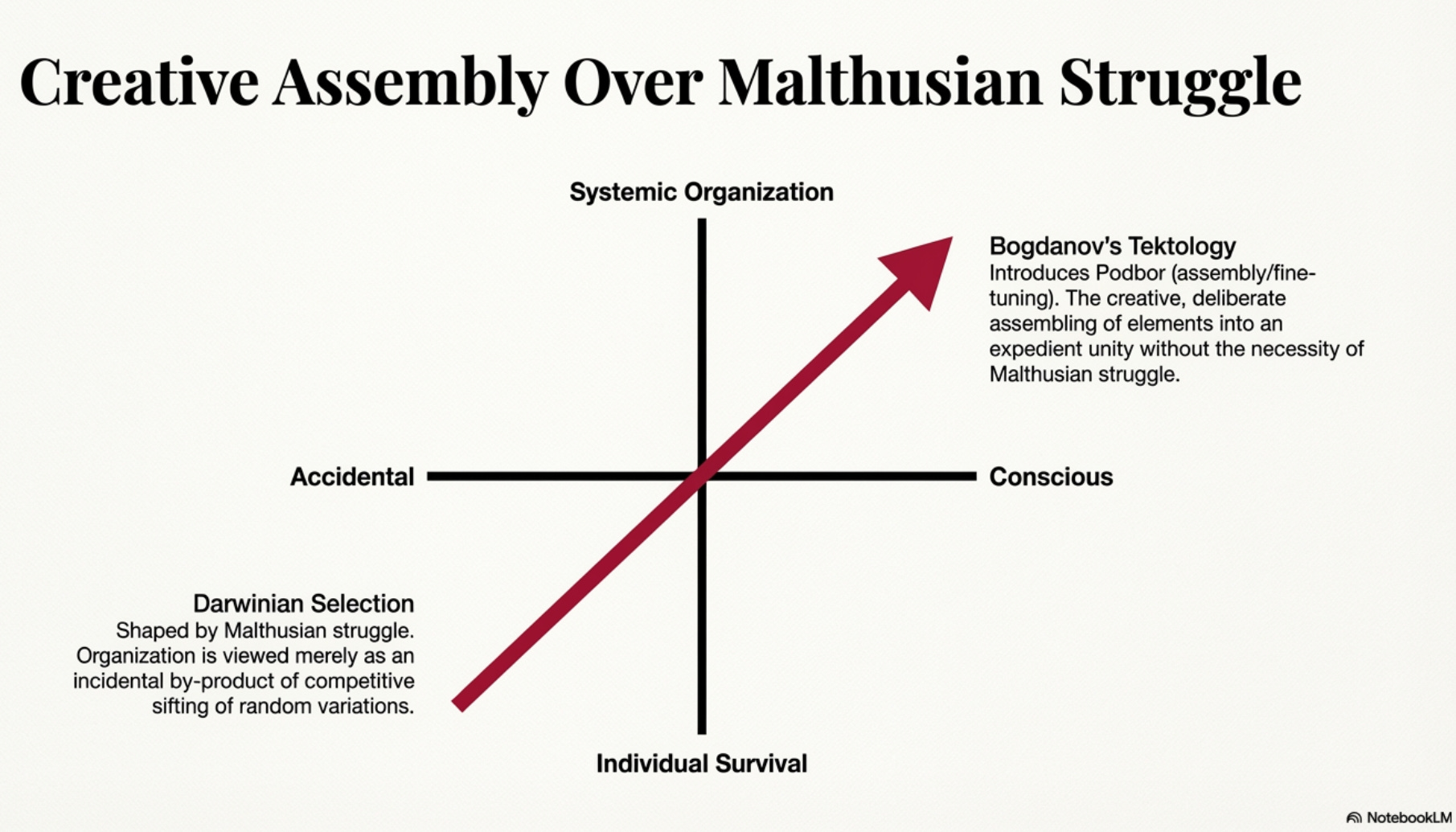 This distinction is not merely semantic. It reflects a fundamentally different understanding of how organized systems come into being and evolve. For Darwin, organization is an incidental by-product of the competitive sifting of random variations. For Bogdanov, organization is the fundamental process itself, the creative assembling of elements into an expedient unity through the concordance of its parts.
