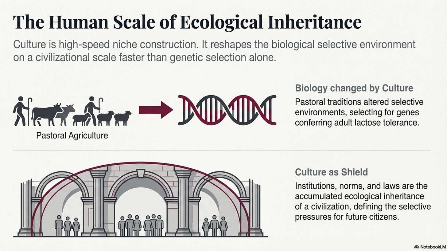 The culturally inherited traditions of pastoralism have altered the selective environments of some human populations for sufficient generations to select for genes that today confer greater adult lactose tolerance. Race realists like to bring up the sickle-cell anemia argument, and more profound readers of modern sociobiology books like to make the case that institutions, norms, laws, and cultural practices of a civilization represent the accumulated ecological inheritance of generations of human niche construction. And just as the quality of ecological inheritance affects the selective pressures acting on future generations of organisms, the quality of civilizational inheritance affects the selective pressures acting on future generations of citizens.