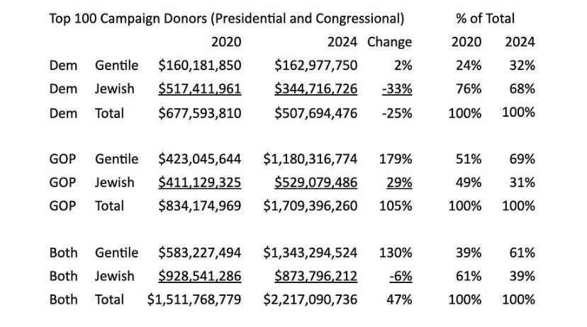 This went into such absurdities, that for the first time in history, the Jewish oligarchs have sent more money to the Republicans than to the Democrats despite the Jewish voters leaning Democrat in a 2-1 to 4-1 ratio.