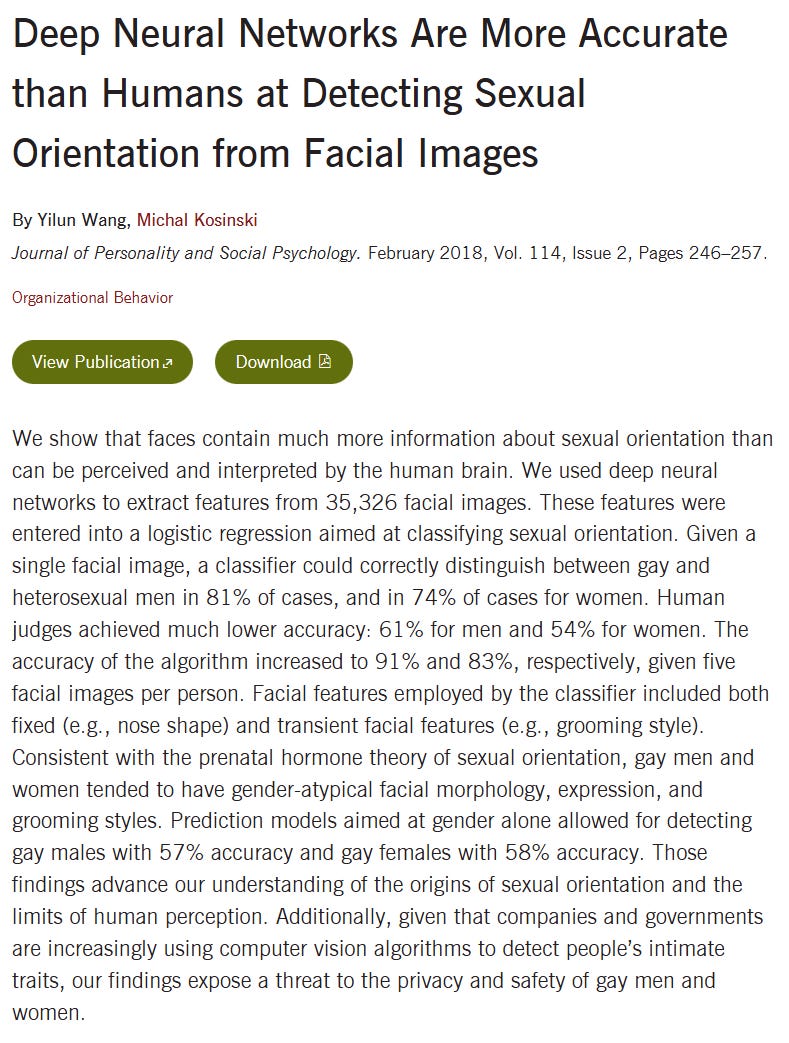 The bottom three personality traits don’t give any significant visual cues yet they are also important, especially as they relate to pro-sociality. Still, even with an accuracy of around 70% that would still be a correlation of up to r=.36 on a static image and up to r=.42 when the advanced AI counts 70 key points of the face, which is still lower than the correlation of a professional non-AI clinical evaluation of Big Five traits.