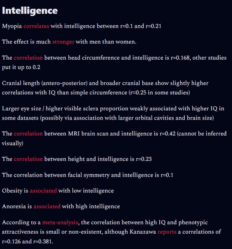 In otherwards, physiognomy tends to be correct in terms of measuring mutational load and neurological disorders, especially at the extremes, but when it comes to the general population or even celebrities as it is often used, it gives modest effects and only when you are using AI or algorithmically analyzing 70 facial features at once yourself somehow.