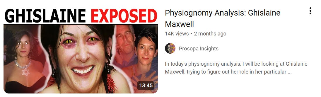 In a video concerning Ghislaine Maxwell I have likewise not seen any scientifically valid application of physiognomy such as fWHR proportions, exploration of asymmetry (proxy for mutational load), forehead proportions and eye size (estimation of her intelligence) and wrinkles on places of muscle contractions (estimation of her dominant mood). Instead the video was filled with “hot reading” of Ghislaine Maxwell’s crime story and the attempted connection of her facial features such as her smile, “Venus face shape”, the tilt of her lips, eyes and how set her eyebrows are. Clearly few of these things matter when their aggregate can’t give any meaningful results unless it’s neuroticism (a proxy for mutational load).