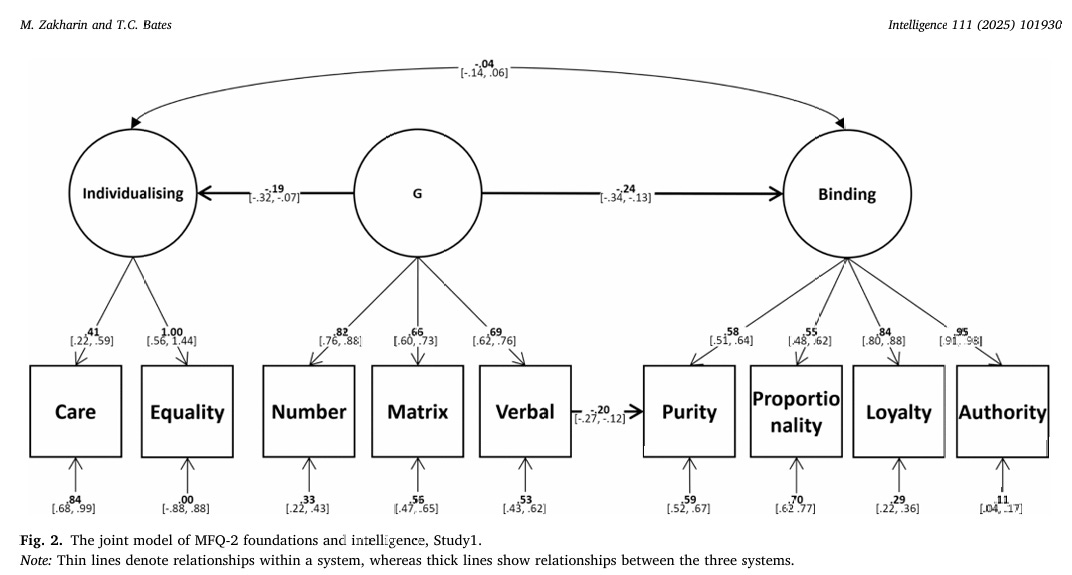 In a recent, highly publicized study by Michael Zakharin and Timothy C. Bates, higher intelligence was found to be negatively correlated to both binding (r=-.24) and individualizing (r=-.19) moral foundations.